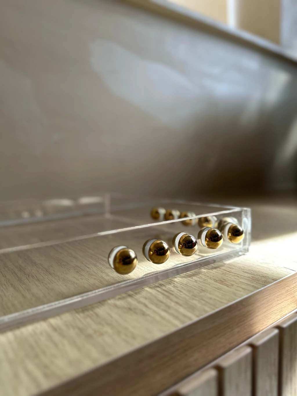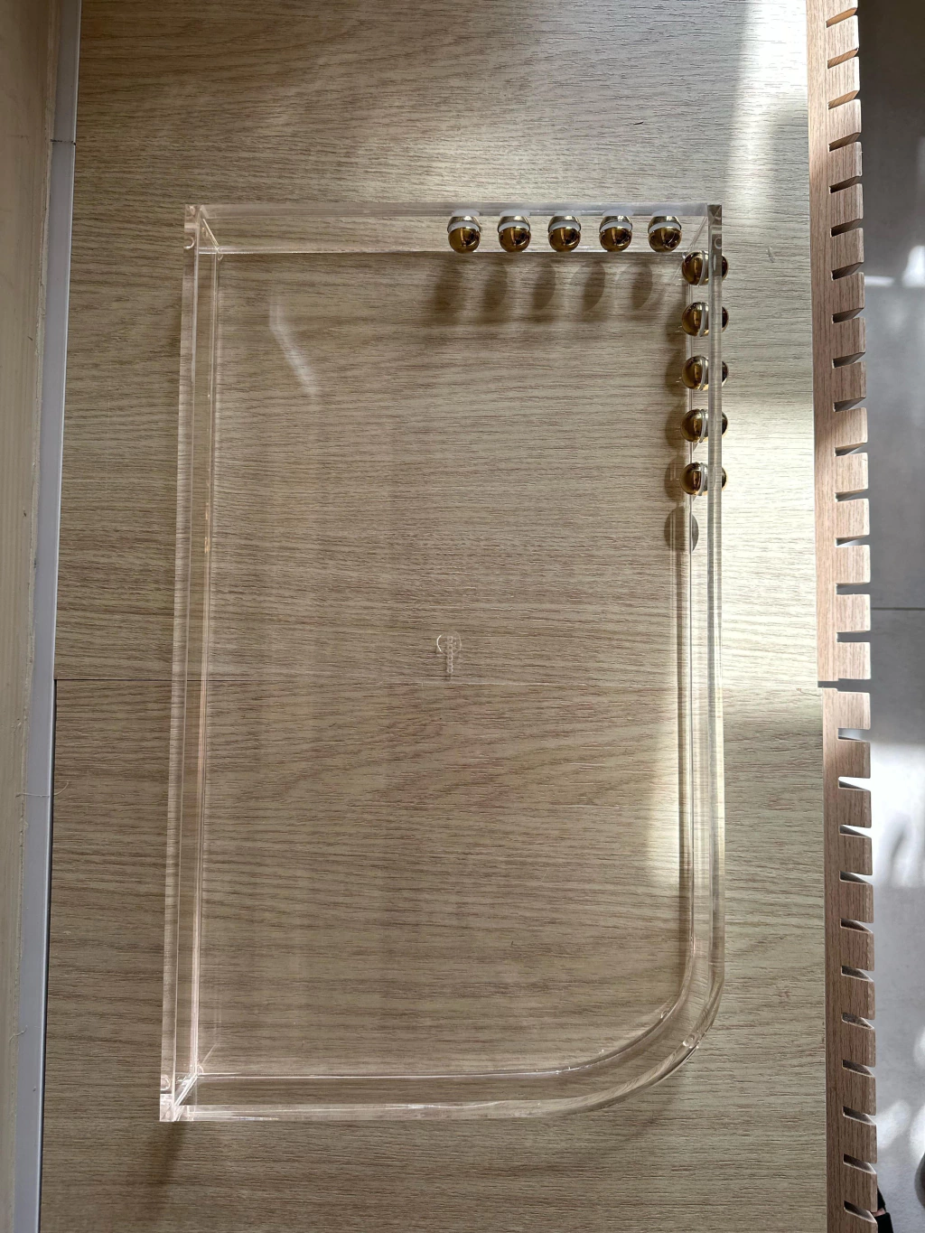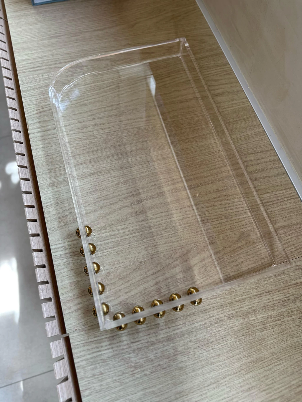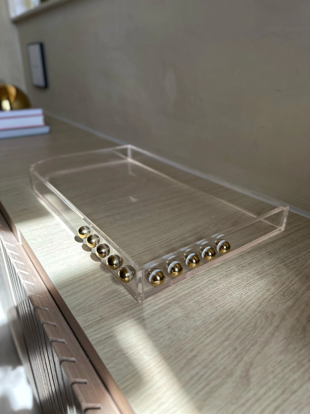 Bandeja em acrílico, medindo: 50x30cm + esfera em aço inox Gold.