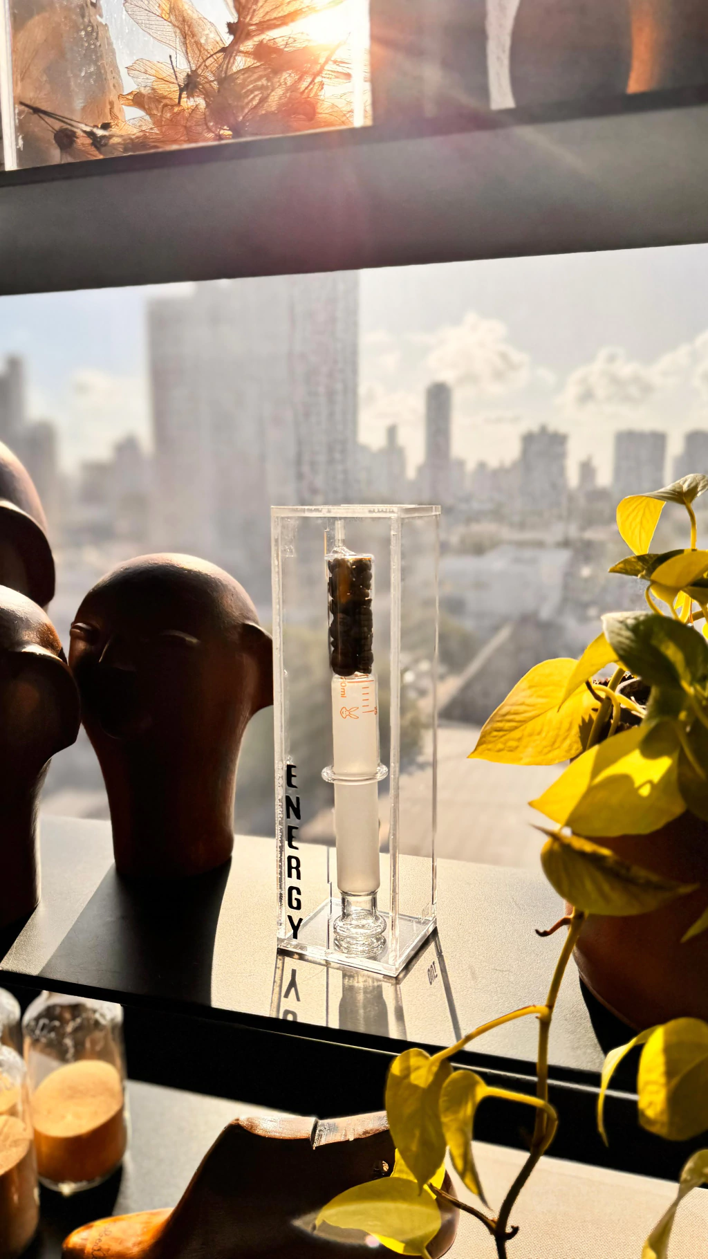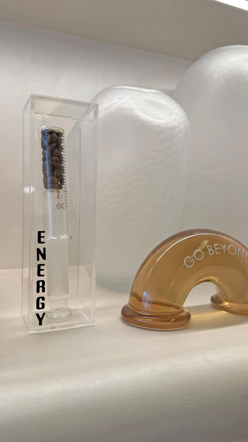 Seringa de vidro contendo grãos de café, apresentada em uma elegante caixa de acrílico. Esta escultura ENERGY SHOT - OUI ART simboliza a importância de manter-se sempre ativo e energizado.
