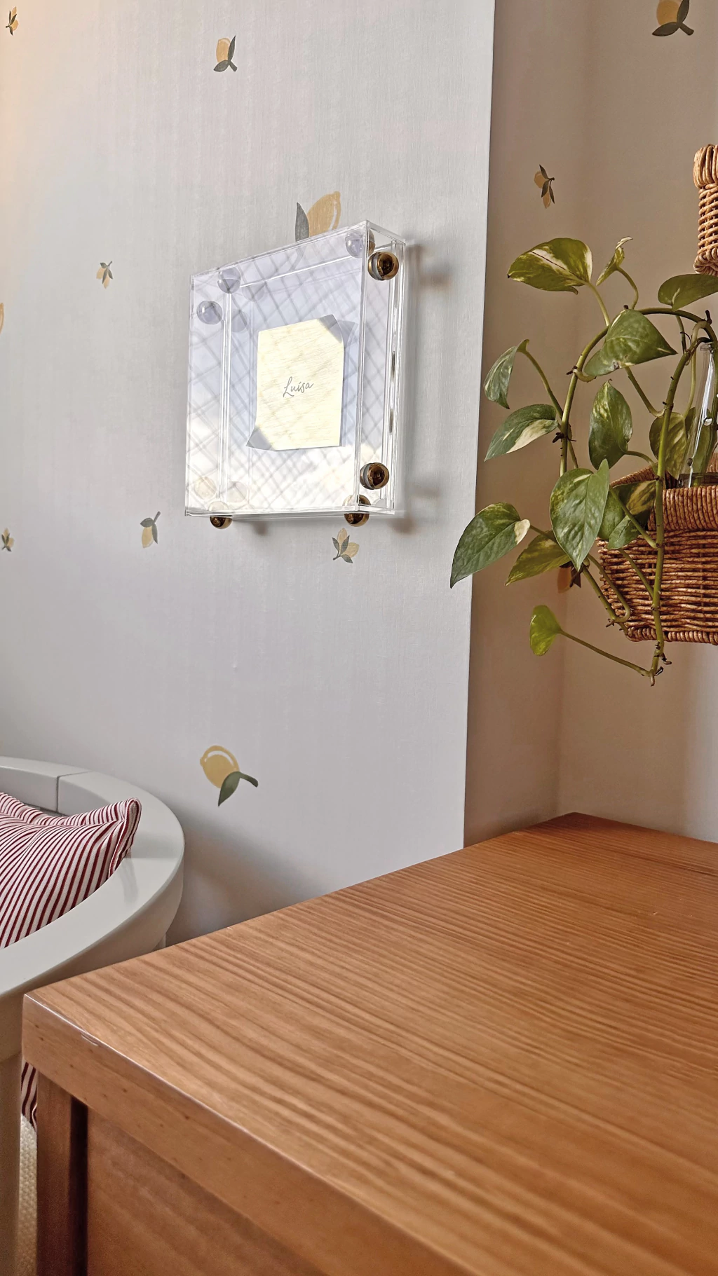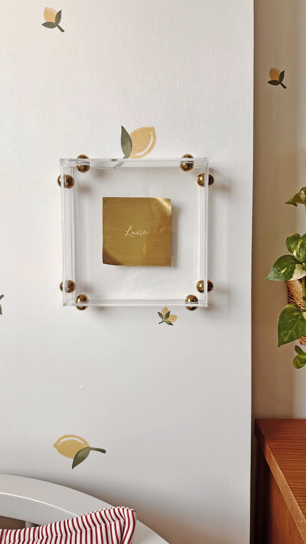 Quadro Ninho 20x20 cm em acrílico com placa personalizada em latão, ideal para dar um toque único a quartos infantis, maternidades ou qualquer ambiente que mereça um charme especial.
